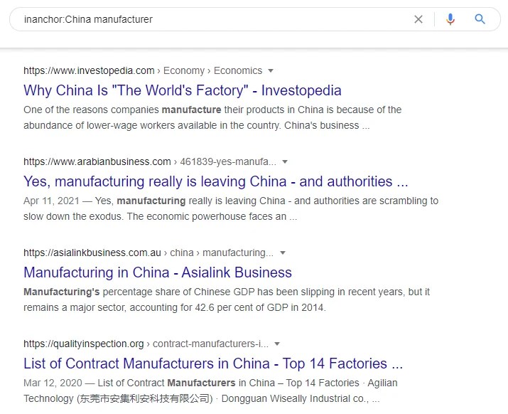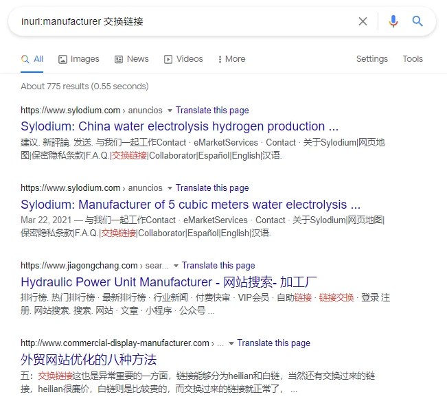 上述高级搜索指令可综合使用,返回更精确的搜索结果。比如下图所示就是 URL 中包含 manufacturer,且页面内容包含 交换链接 的页面。大家可以先将单个搜索指令用熟练了之后再尝试综合搜索指令。