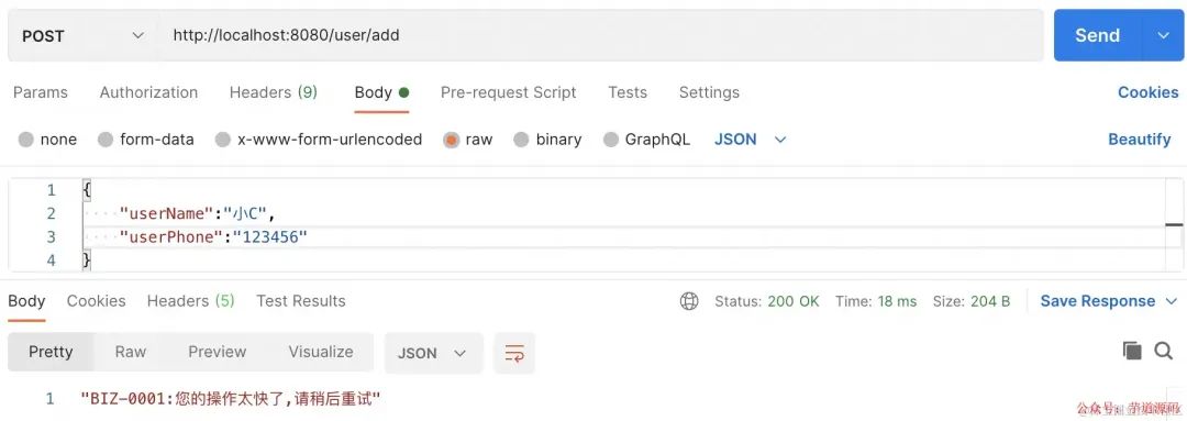 短时间内重复提交,”BIZ-0001:您的操作太快了,请稍后重试”