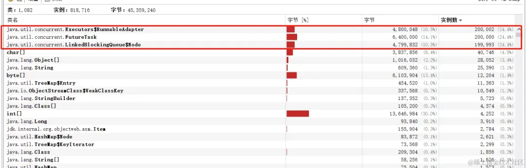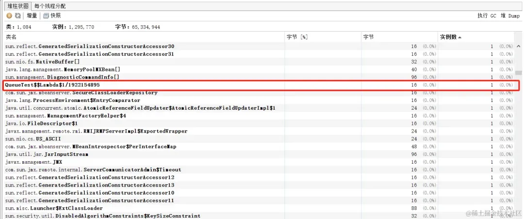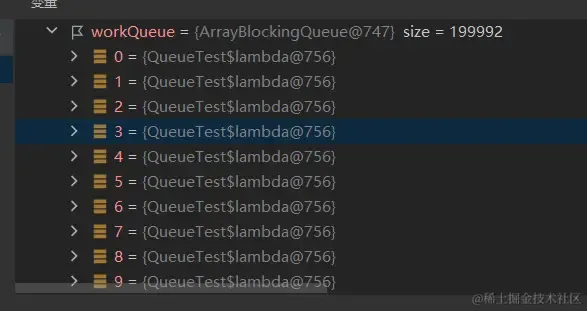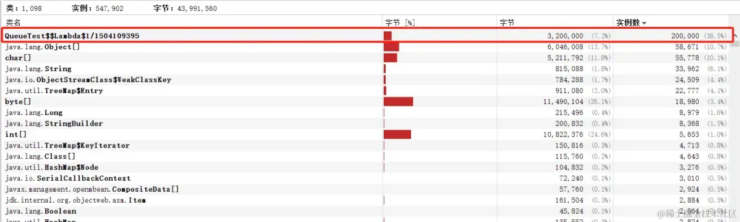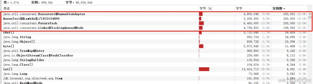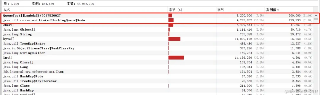 如果是使用 ArrayBlockingQueue 的话,只有lambda实例这一个开销,所以只会使用320w个字节,约3.05MB内存,比起 LinkedBlockingQueue 少了一倍不止