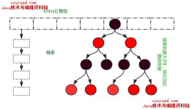 - HashMap: JDK1.8之前HashMap由数组+链表组成的,数组是HashMap的主体,链表则是主要为了解决哈希冲突而存在的(“拉链法”解决冲突).JDK1.8以后在解决哈希冲突时有了较大的变化,当链表长度大于阈值(默认为8)时,将链表转化为红黑树,以减少搜索时间