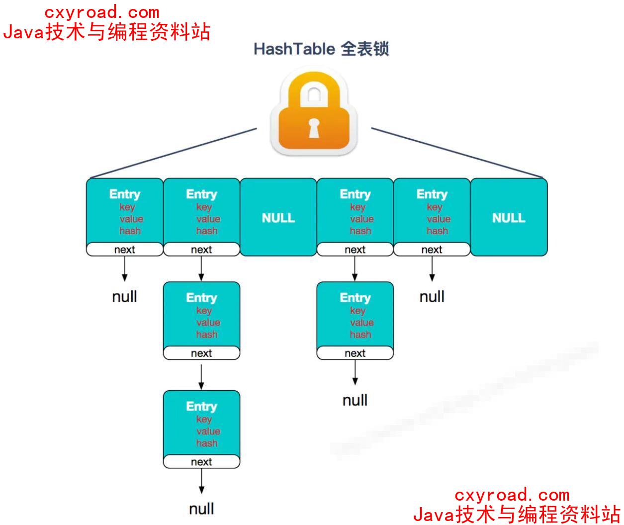 - ② Hashtable(同一把锁) :使用 synchronized 来保证线程安全,效率非常低下。当一个线程访问同步方法时,其他线程也访问同步方法,可能会进入阻塞或轮询状态,如使用 put 添加元素,另一个线程不能使用 put 添加元素,也不能使用 get,竞争会越来越激烈效率越低。
