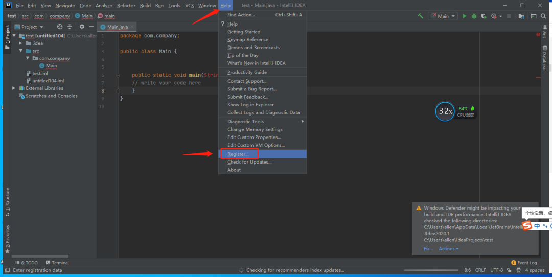 进入 IDEA 界面后,点击 Help -> Register 查看: