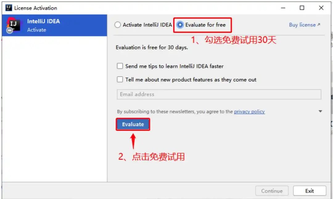 6.等待 IDEA 2021.1 运行, 中间会先弹出一个注册框,我们勾选 Evaluate for free, 点击 Evaluate, 先试用30天: