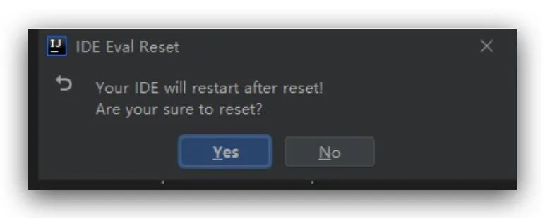 • 按钮:Reset 点击会询问是否重置试用30天并重启IDE。选择Yes则执行重置操作并重启IDE生效,选择No则什么也不做。(此为手动重置方式