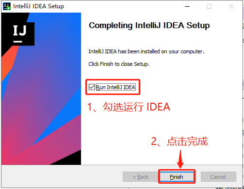 5.安装完成后,勾选 Run IntelliJ IDEA,点击 Finish 运行软件: