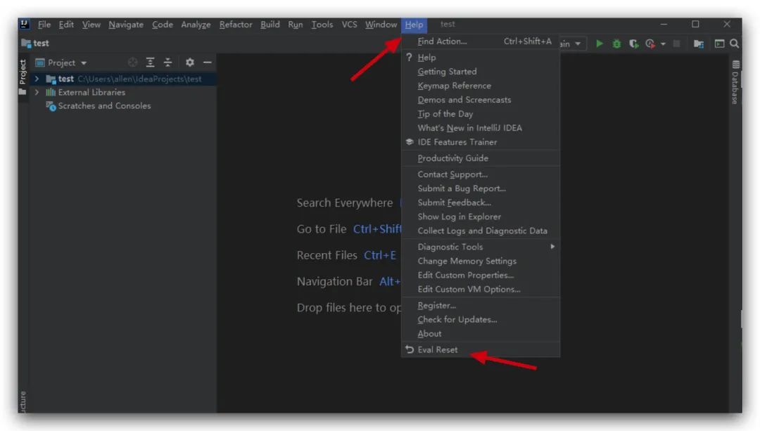 • 如果IDE打开了项目,点击菜单:Help -> Eval Reset