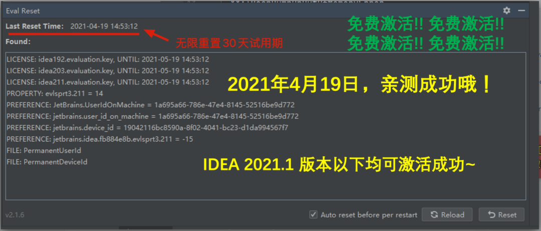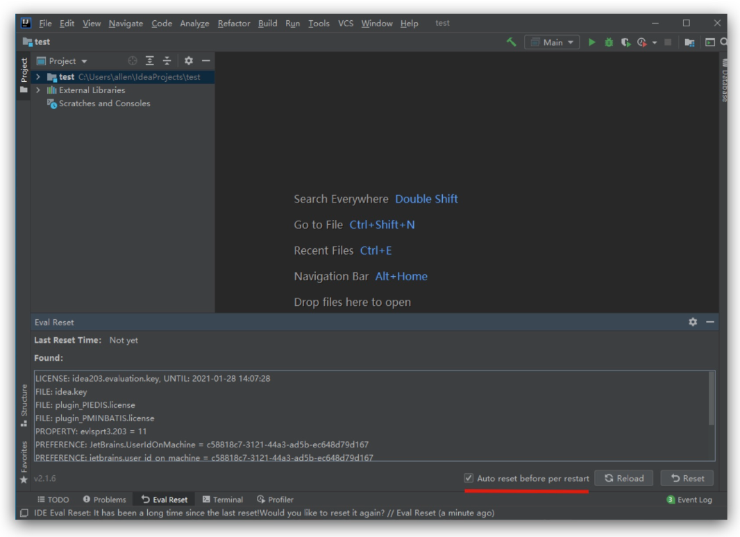 • 勾选项:Auto reset before per restart 如果勾选了,则自勾选后每次重启/退出IDE时会自动重置试用信息,你无需做额外的事情。(此为自动重置方式)